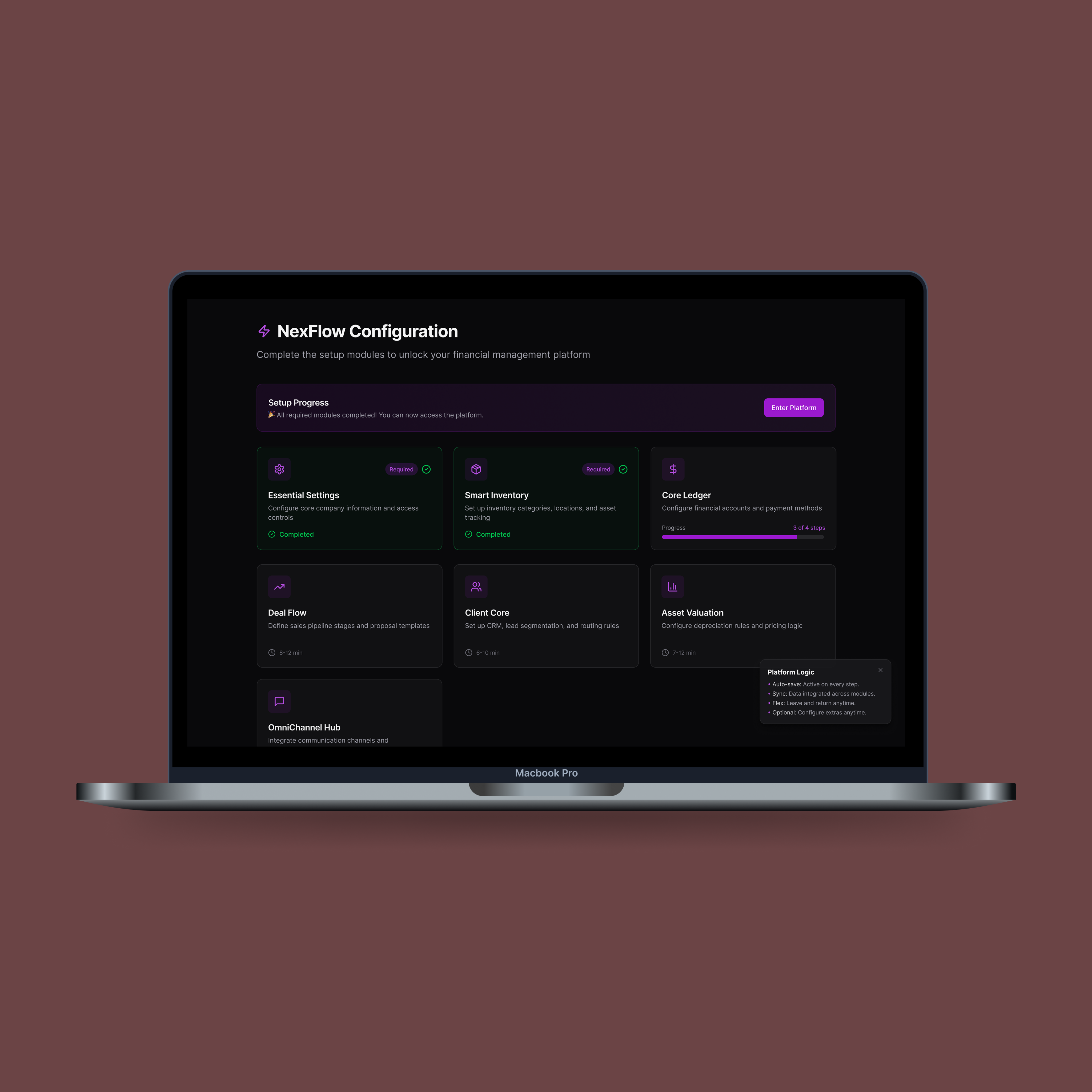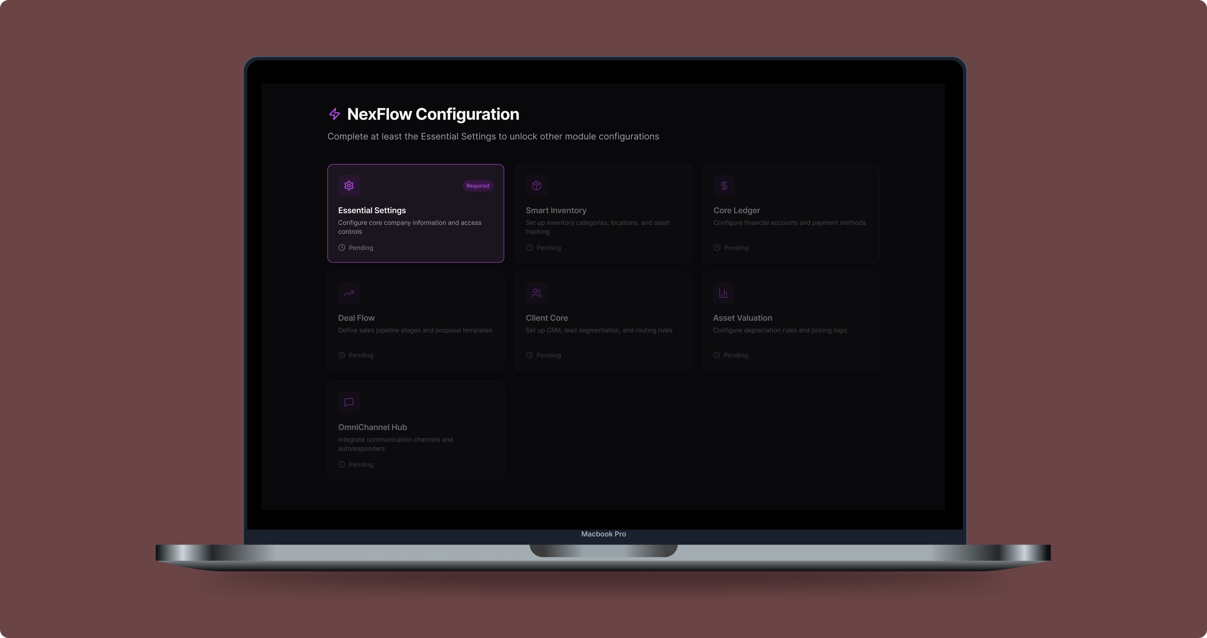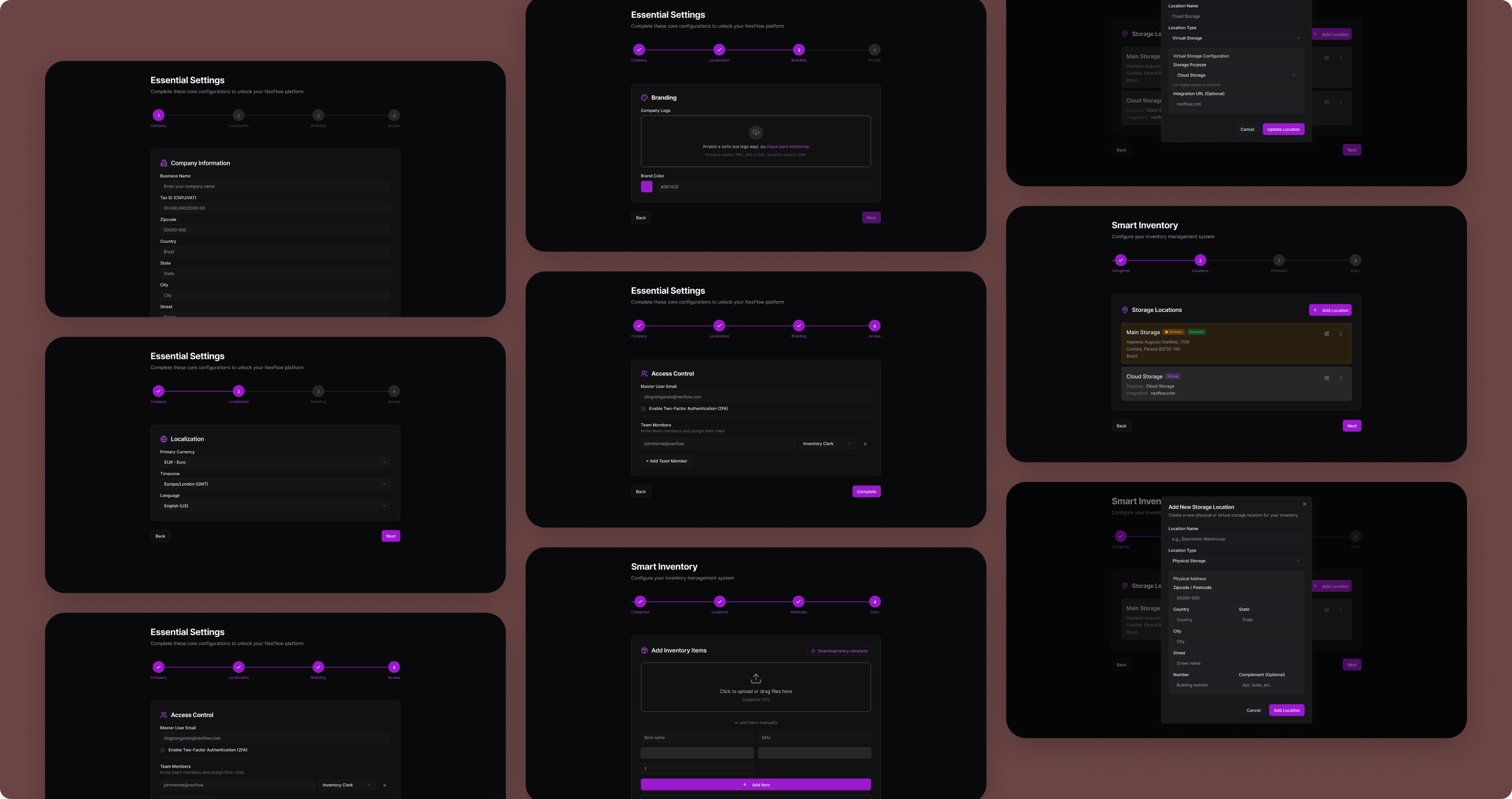 A direção central foi tratar a ativação não como um cadastro técnico, mas como uma jornada de construção progressiva. Em vez de entregar a plataforma completa de uma vez, o fluxo foi estruturado em torno de uma sequência que fazia sentido para o usuário, começando pelos dados core da empresa no Essential Settings e avançando para os Single-Module Setups conforme a base estava estabelecida.