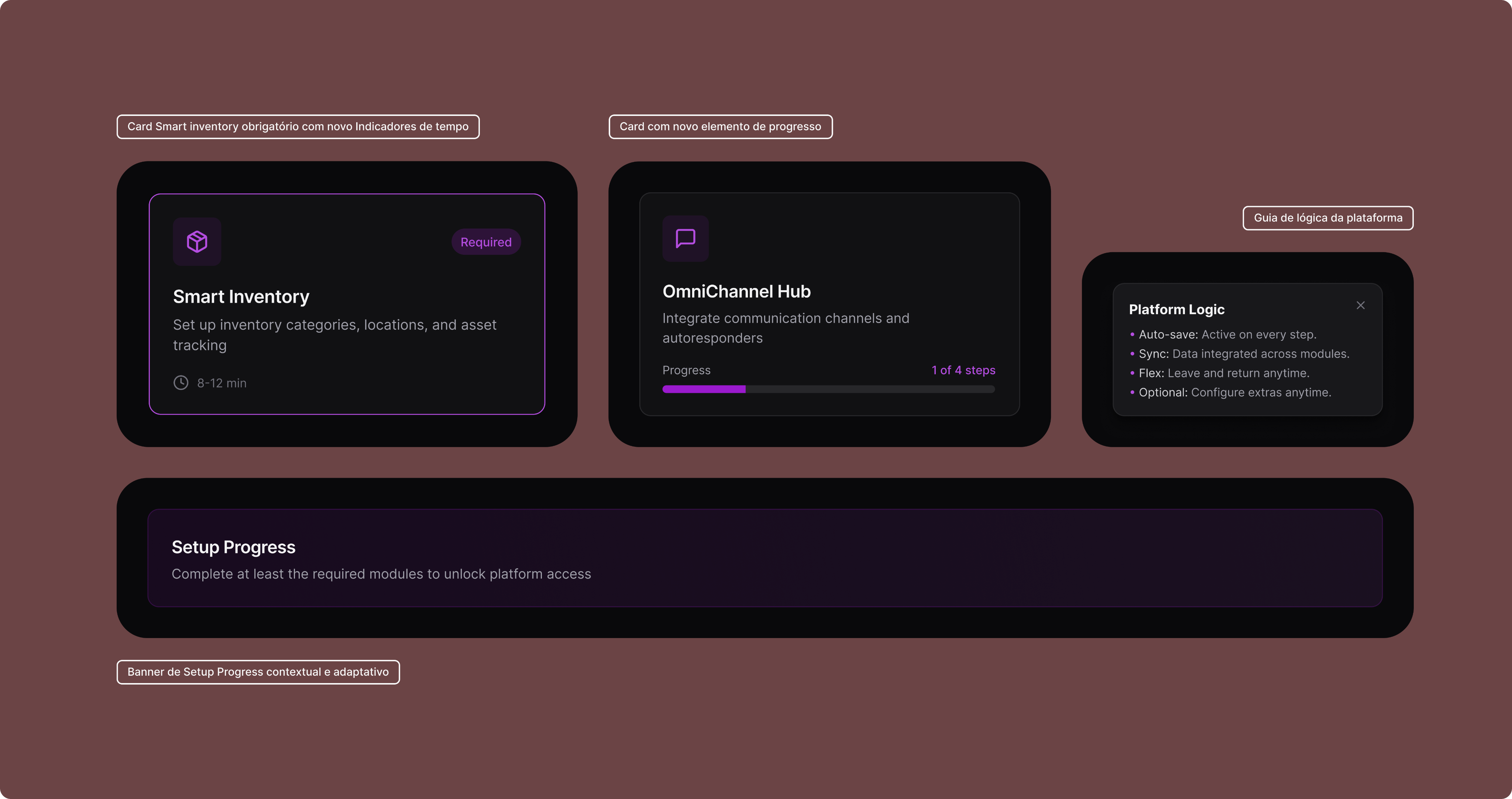 O hub de configuração reforçava essa lógica: deixava claro o que era obrigatório, o que era opcional, e permitia que o usuário saísse e voltasse a qualquer momento sem perder o progresso.