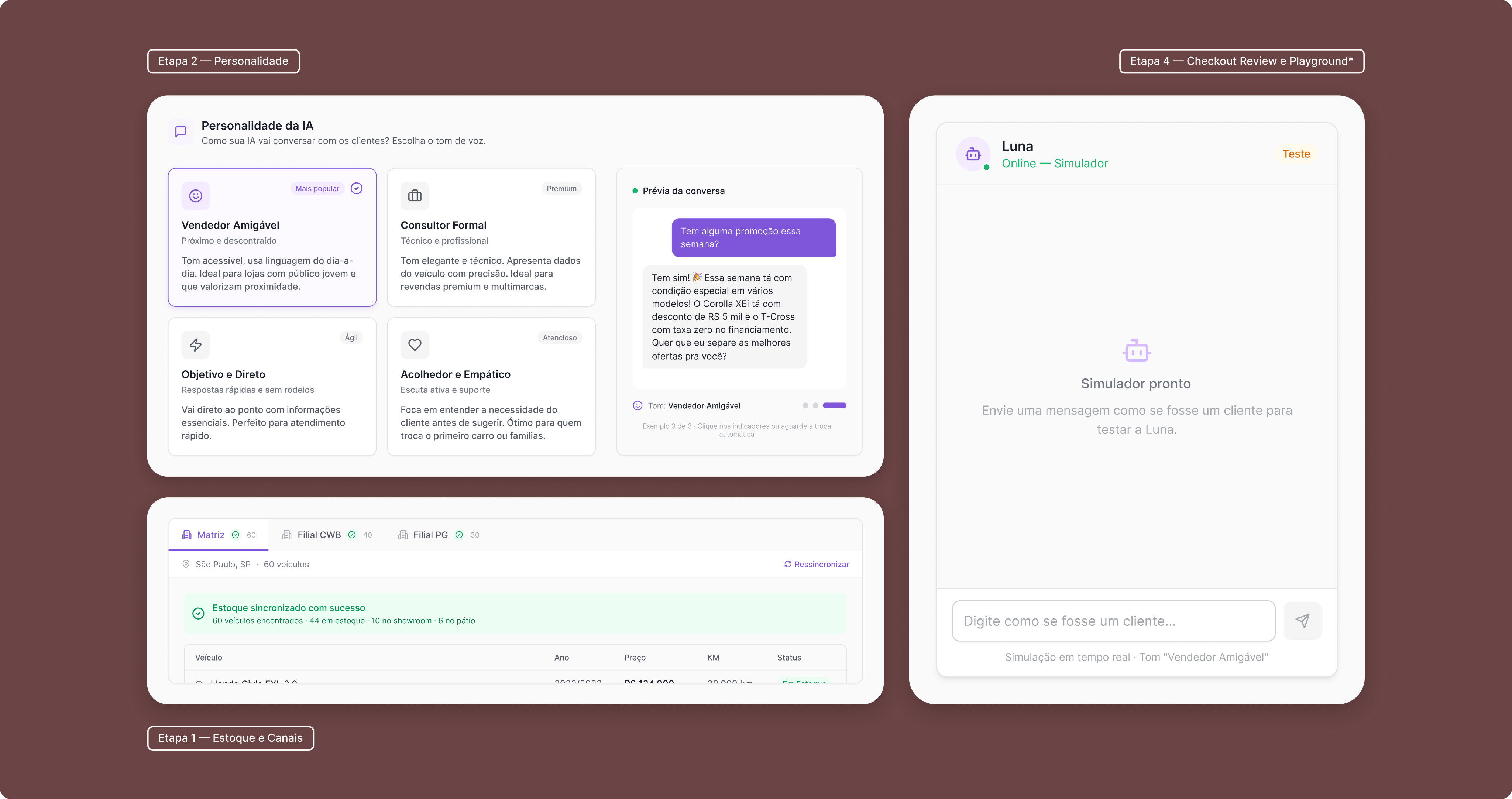 Boas-vindas → Conexão de canais + sincronização de estoque → Seleção de personalidade via cards → Definição de horários e rodízio de leads → Checkout com resumo → Confirmação e publicação.