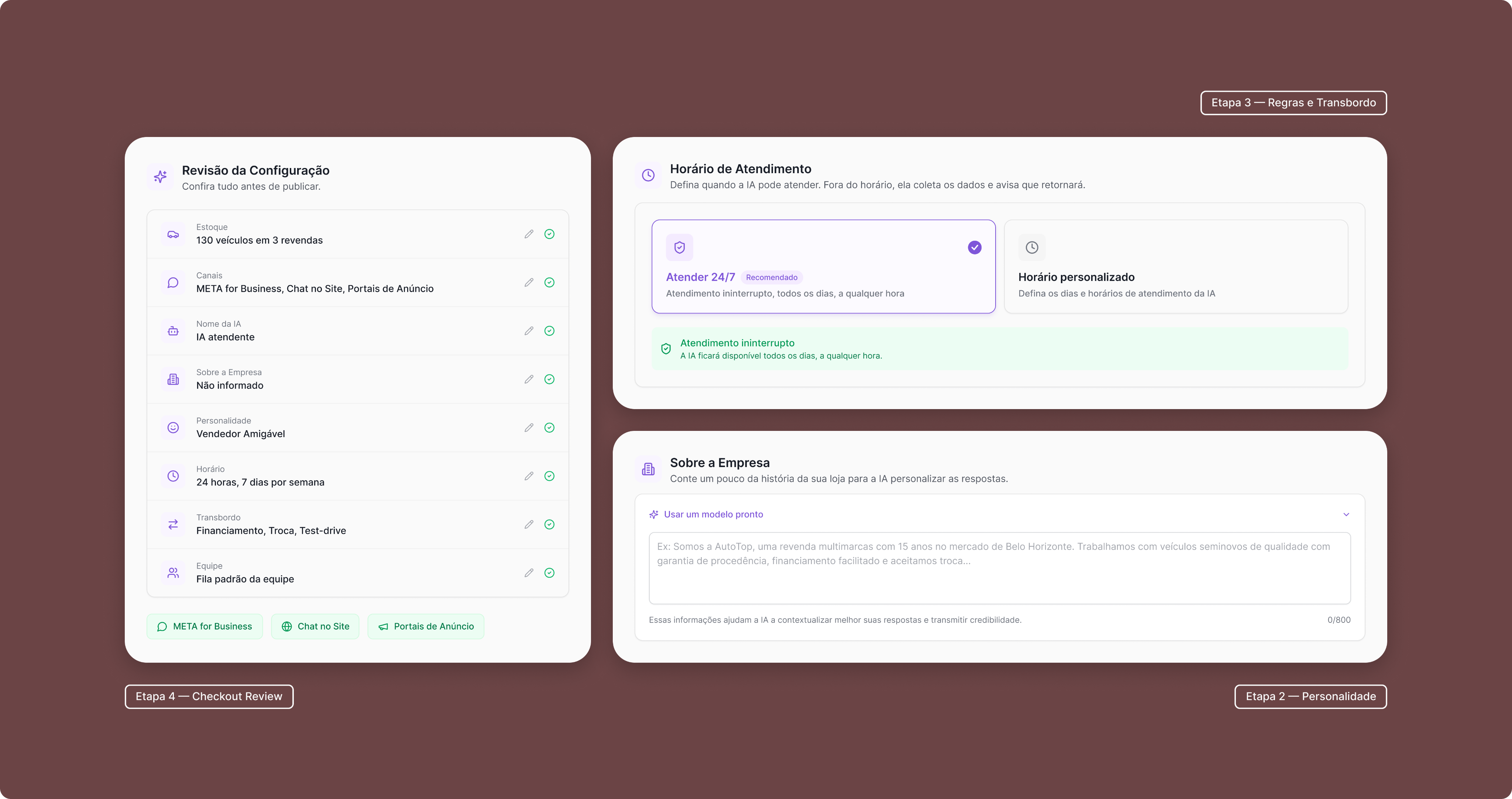 Boas-vindas → Sincronização de estoque + Escolha de canais → Escolha de nome + Preenchimento do sobre a revenda + Seleção de personalidade via cards → Definição de horários + Regras de transbordo + Rodízio de leads → Checkout com resumo → Confirmação e publicação.