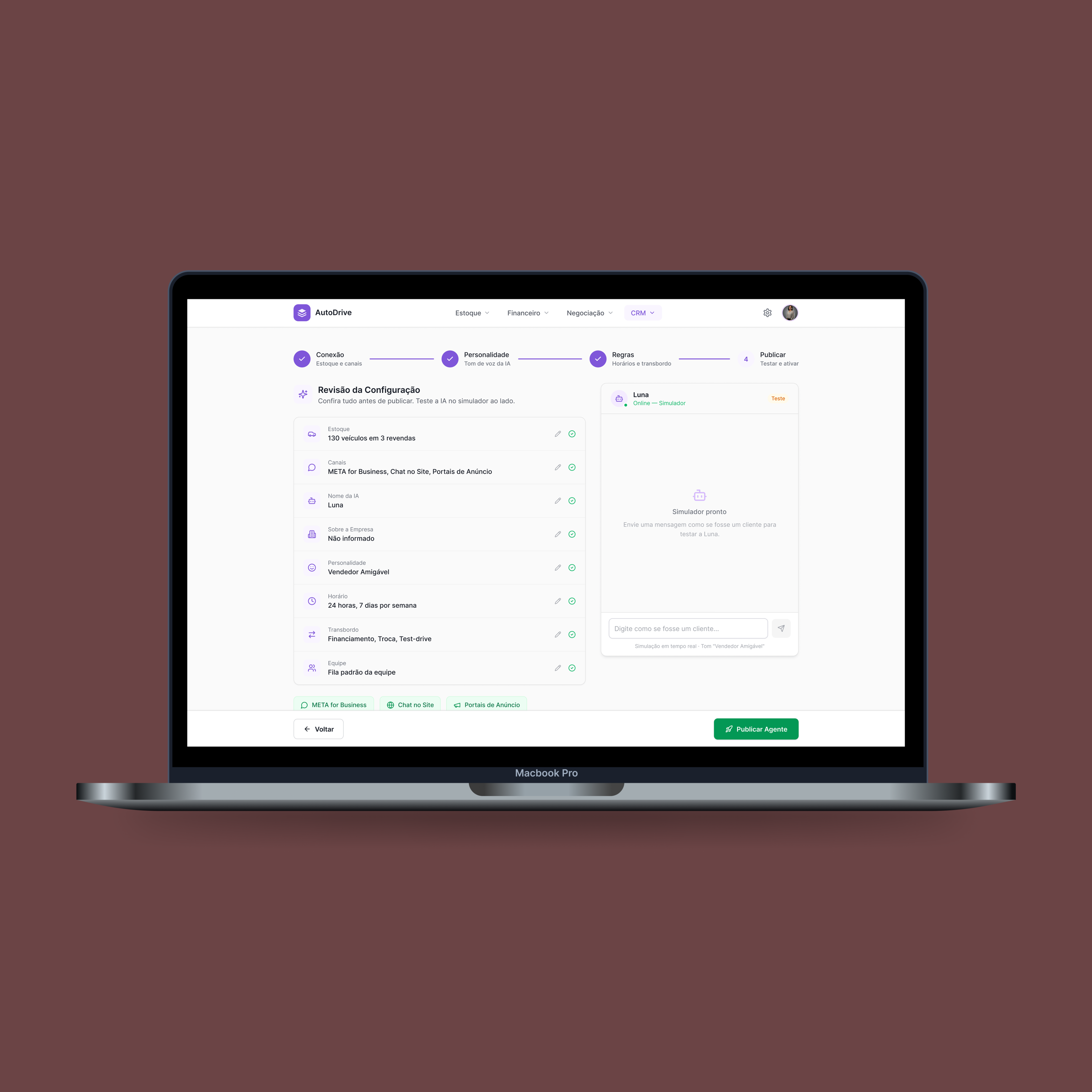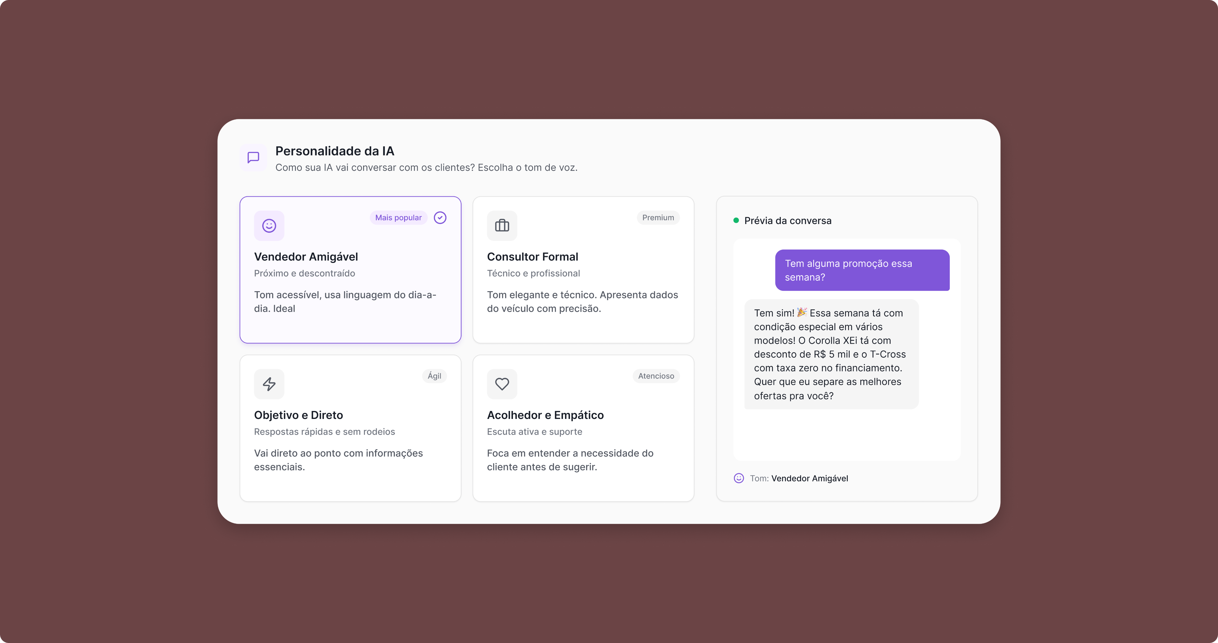 O desafio de design surgiu a partir dessa realidade, como permitir que um gestor de revenda sem perfil técnico configurasse e personalizasse um agente de IA complexo de forma autônoma? Isso exigia traduzir regras complexas de prompt e lógica de engenharia em escolhas simples e visuais, eliminando a necessidade de mãos internas a cada nova ativação e tornando o setup acessível e prático para o perfil do cliente final.